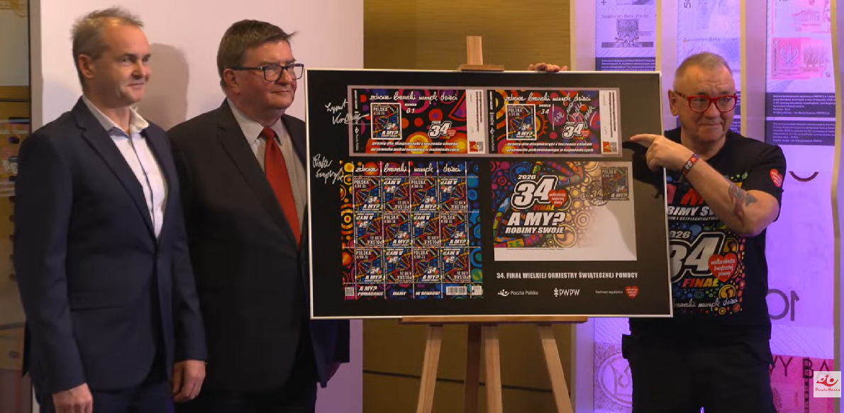 Znaczek na finał WOŚP prezentowali (od lewej): Piotr Szajczyk, Zygmunt Kostkiewicz i Jurek Owsiak