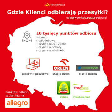 Klienci Poczty Polskiej mają do dyspozycji już 10 tys. punktów odbioru: placówki i automaty pocztowe, sklepy Żabka i Freshmarket, stacje paliw Orlen oraz kioski RUCH-u. Kluczem do sukcesu są dobre lokalizacje oraz szybka i wygodna dostawa, która dla klientów jest coraz ważniejszym czynnikiem i od niego uzależniają swoje decyzje zakupowe w sieci. Odbiór w PUNKCIE to wygodna usługa umożliwiająca odebranie przesyłki w wybranym przez siebie miejscu i o dogodnej porze. Można to zrobić na przykład w drodze do pracy, przy okazji tankowania samochodu, robienia drobnych zakupów w osiedlowym sklepie albo odbierając dziecko ze szkoły. To klient decyduje, skąd odbierze swoją przesyłkę. W ramach sieci Poczta udostępnia punkty czynne 24h, bądź działające do późnych godzin wieczornych 7 dni w tygodniu. W najbliższych miesiącach liczba punktów dostępnych w sieci wzrośnie do 11 tysięcy.