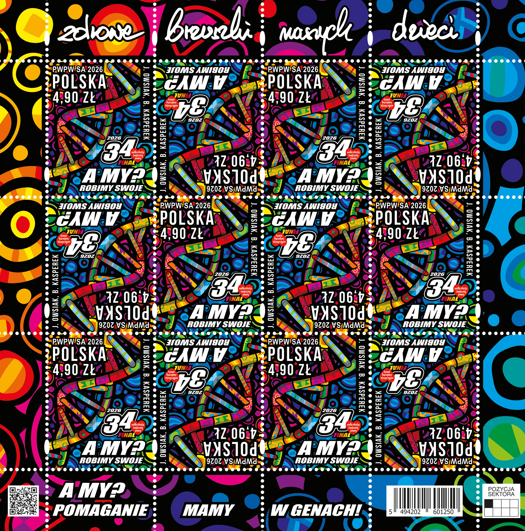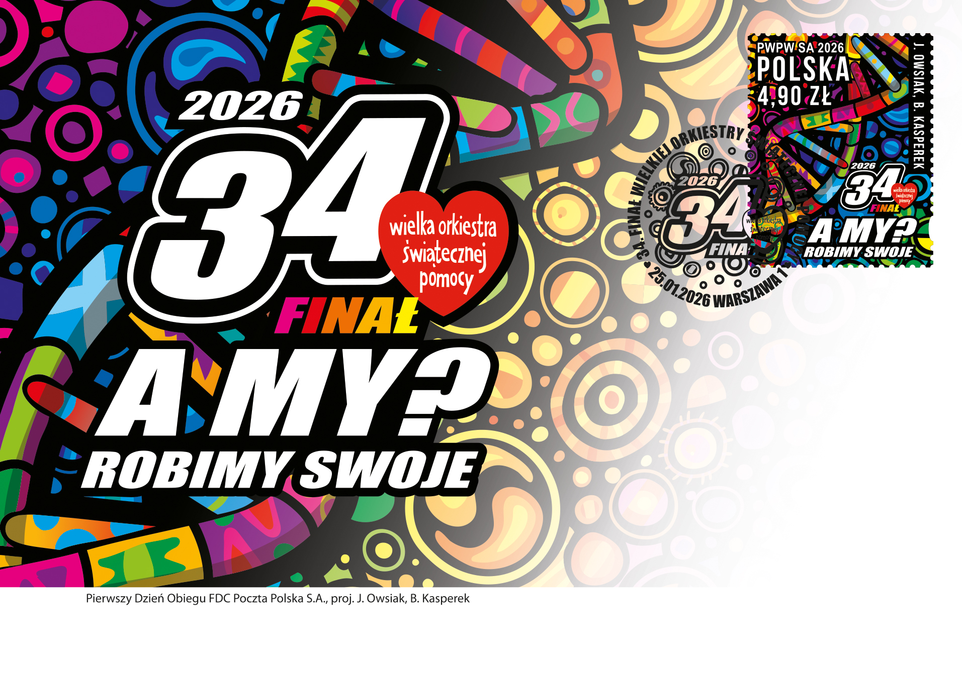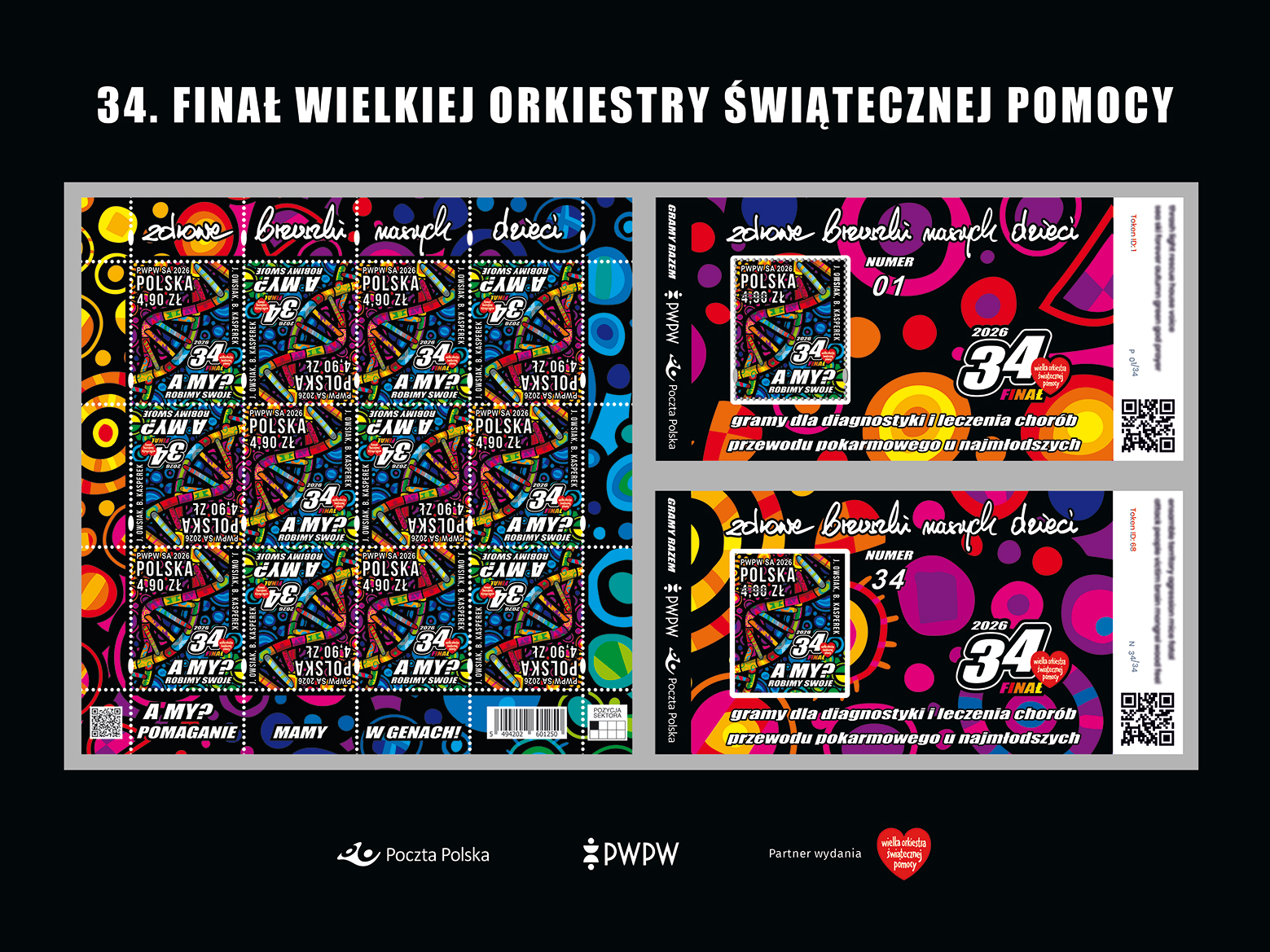 Poczta Polska i Polska Wytwórnia Papierów Wartościowych wyemitowały specjalny znaczek, zaprojektowany przez Jerzego Owsiaka i Barbarę Kasperek. - Znaczek 34. Finału to kolor, zawijasy w kodach DNA i mnóstwo innych form życia we wszystkich barwach świata – właśnie tak opowiadamy o zdrowych brzuszkach naszych dzieci, czyli gastroenterologii dziecięcej -mówił podczas prezentacji znaczka Jurek Owsiak, Prezes Zarządu Fundacji WOŚP.