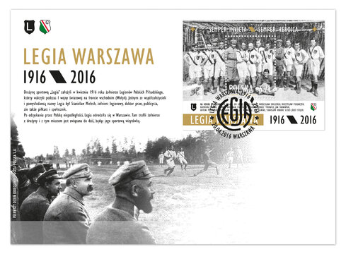 Poczta Polska wprowadza do obiegu emisję „Legia Warszawa 1916\2016”. Znaczek w bloku o wartości 6 zł wydawany jest z okazji setnej rocznicy założenia klubu sportowego Legia. Początki Legii sięgają obozu Legionów Polskich na Wołyniu. To tam żołnierze Piłsudskiego, walczący podczas I wojny światowej na froncie wołyńskim, założyli w kwietniu 1916 roku piłkarską Drużynę Sportową Legia.